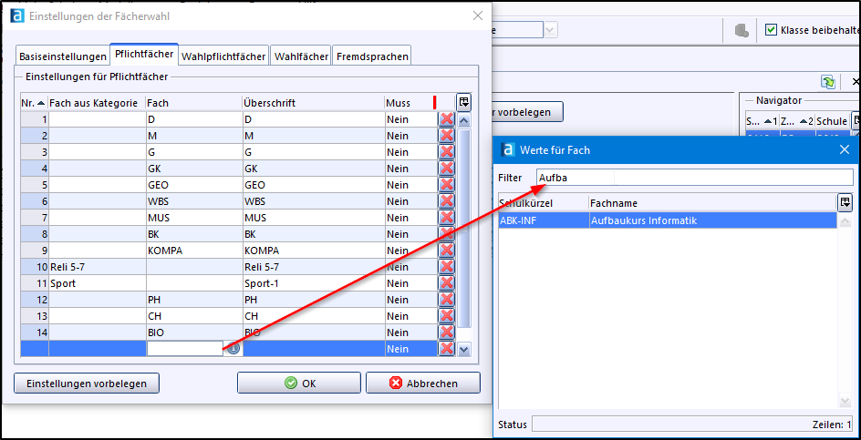 Es wird zwischen Fächern und Fachkategorien unterschieden. Eine Fachkategorie wird verwendet, sobald der Schüler eine Wahlmöglichkeit zwischen mehreren Fächern hat (z. B. 1. Fremdsprache: Wahlmöglichkeit zwischen Englisch und Französisch).