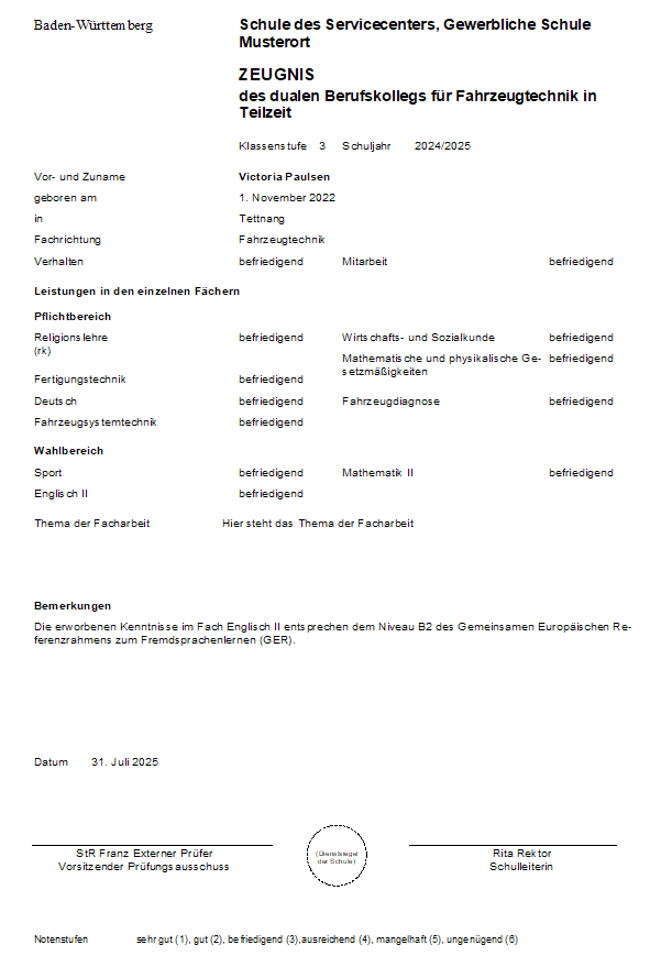 p Die unterschiedlichen Texte auf den Zeugnissen werden gemäß der in den Klassen zugewiesenen Stundentafeln erstellt. Siehe Voraussetzungen. Für die Erfassung von Einzelnoten bei zwei Abschlüssen (Assistent und Fachhochschulreife) können Sie die von uns bereitgestellten Notenblöcke verwenden. (Einstellungen Notenverwaltung) |